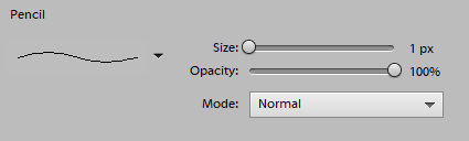 - Pilih Pencil Tool dan atur Size menjadi 1 px dan Opacity menjadi 100%