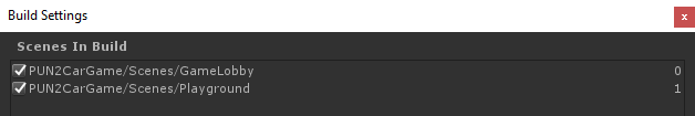 - Tambahkan GameLobby dan Playground Scenes ke pengaturan Build: