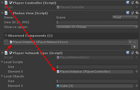 }- Tambahkan skrip PlayerNetworkSync.cs ke PlayerInstance dan tetapkan ke Komponen Pengamatan PhotonView.