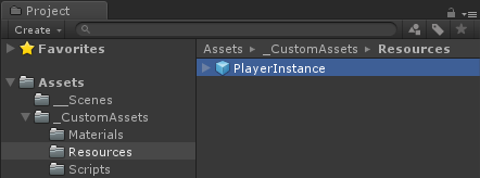 - Simpan PlayerInstance ke Prefab dan pindahkan ke folder bernama Resources (Jika tidak ada folder seperti itu, buatlah folder tersebut). Langkah ini diperlukan untuk dapat menelurkan Objek multipemain melalui Jaringan.