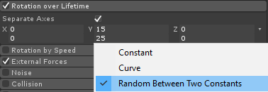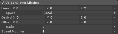 - Dalam Sistem Partikel, aktifkan modul berikut: Emission, Shape, Velocity over Lifetime, Color over Lifetime, Size over Lifetime , Rotasi Seumur Hidup, Kekuatan Eksternal, Renderer.