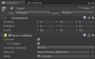 - Tambahkan komponen MeshCollider ke "Trigger" GameObject, centang Convex dan IsTrigger, dan ubah Mesh-nya menjadi Cylinder default